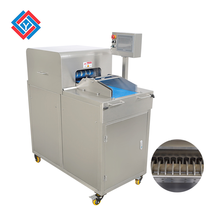 這款切肉丁機整體采用了不銹鋼制作,機身鋼板厚度達到了3mm,表面使用了拋光拉絲處理工藝,優(yōu)化衛(wèi)生方便清洗,切肉丁機的刀片是不銹鋼材質,特別淬火加工過后,可用鋒利的刀片將鮮肉開條再切塊,切割紅殺肉塊的肉丁迅速且大小均勻,機身同時還采用了快拆式刀組,方便更換加工其他肉類,省去了大量的人工成本。